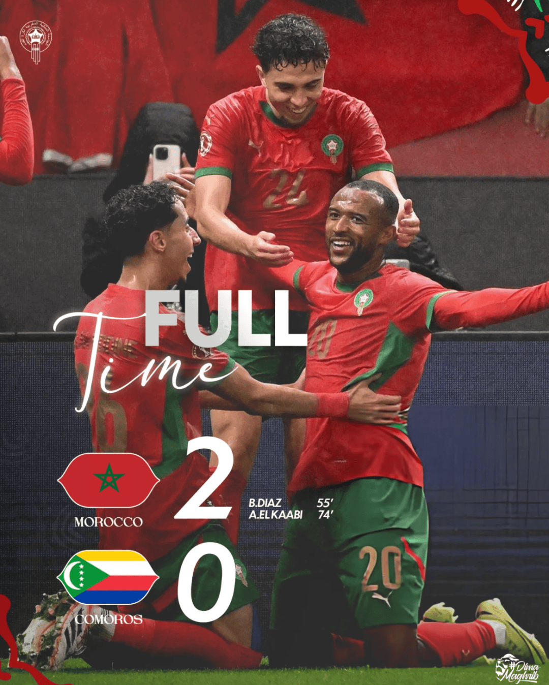 摩洛哥在上周日的非洲杯揭幕战中2-0轻取科摩罗连续四届取得开门红,比赛在大雨中进行,开幕式由摩洛哥王储哈桑主持。阿什拉夫和里尔前锋Hamza Igamane因伤缺席。摩洛哥上半场获得点球,阿布扎比艾因的亚冠冠军得主拉希米主罚点球被扑错失领先机会。随后多哈萨德中卫Romain Saiss因伤退场。下半场皇家贝蒂斯中场阿姆拉巴特挑传,曼联后卫马兹拉维助攻皇家马德里前锋迪亚斯首开纪录。科摩罗门将Yannick Pandor下半场多次救险抢镜。第74分钟奥林匹亚科斯前锋Ayoub El Kaabi倒钩破门,河北华夏幸福旧将可能打入了本届非洲杯最精彩的进球。最终摩洛哥主场完胜,东道主全场控球率高达70%。
