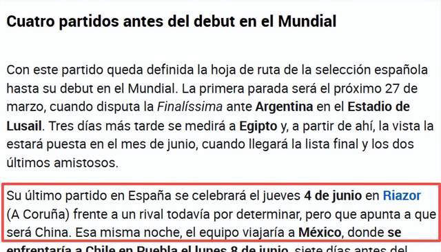 进入6月份,西班牙还安排了两场重要的热身赛。已确定的是6月8日在墨西哥普埃布拉举办的对阵智利,而6月4日在西班牙拉科鲁尼亚里亚索球场的比赛对手尚未公布。有消息称,这场热身赛极有可能是对阵中国男足。赛后,西班牙队将连夜启程前往墨西哥,为世界杯做最后准备。