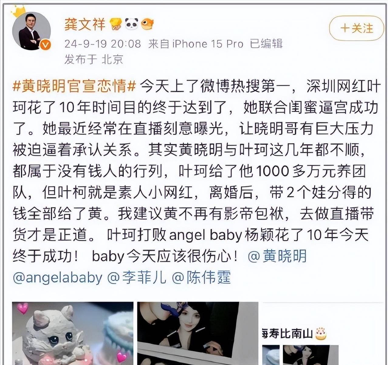 事情要追溯到2024年9月,当时黄晓明在微博高调官宣与叶珂的恋情,没想到这份甜蜜还没等来祝福,就遭遇了网络大V龚文祥的狙击。这位拥有600万粉丝的网红博主接连发布多篇爆料文章,用捞女、背假爱马仕等极具攻击性的词汇形容叶珂,更夸张的是,他还编造叶珂倒贴黄晓明一千多万的离奇故事。为了增加可信度,龚文祥甚至煞有介事地分析起黄晓明的财务状况,声称其收入大不如前,连当年与杨颖的世纪婚礼都是夸大其词。