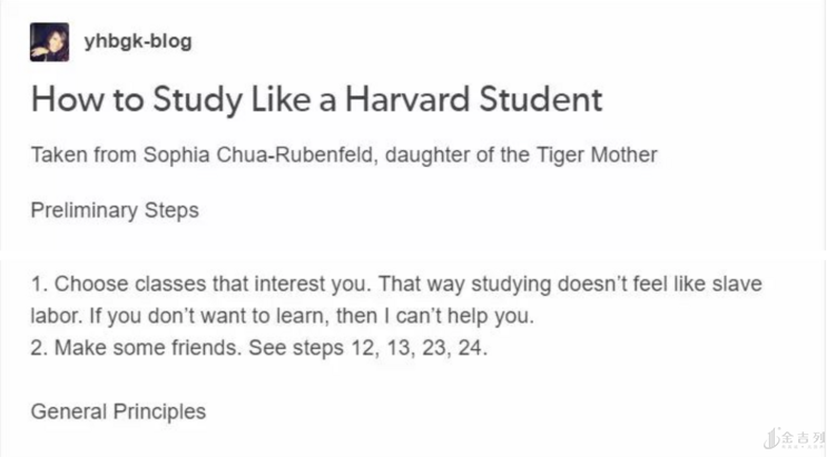 23. 人们通常看不上死记硬背。但即使是哈佛这样的知名学府,也会要求学生背公式、名字和日期。为了有效记忆,不要再一遍又一遍读笔记,这没什么用。大声说出来并且用笔写下来,还可以和朋友相互提问。24. 让朋友倾听自己解释一个较难的概念,这会强迫我们阐述自己的理解,请记住, 含糊不清一点都不好。