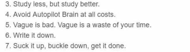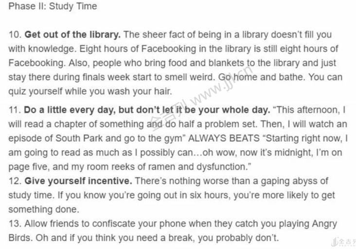 11. 每天定个小目标,但不要让它占据一整天时间。比如“今天下午我要读一章节书,做一半习题,然后再去健身房。”一般要优于“现在开始,我要尽可能地多读书。。。。。。现在已经午夜了,我看到第五页了,但是我又饿又困,好想吃东西休息。”