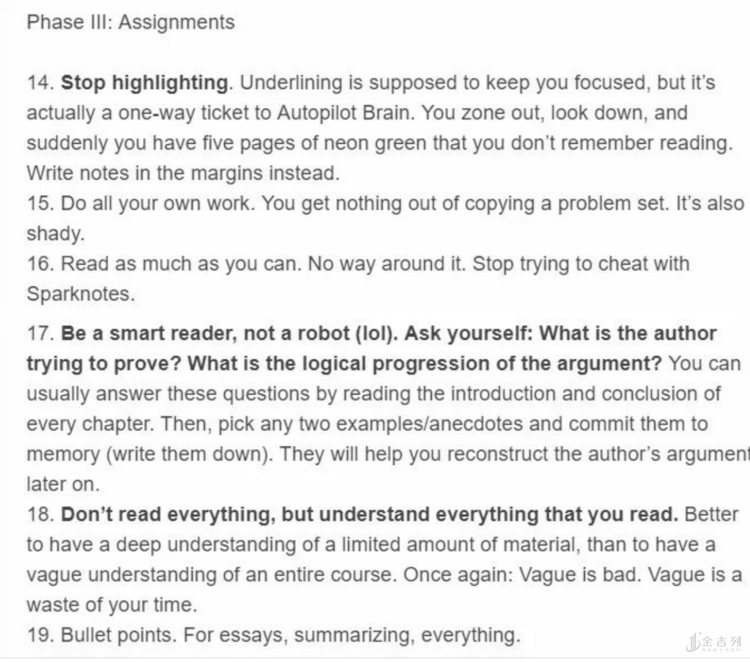18. 不要什么都读,但要理解自己所读的所有。最好对有限的材料有深入地理解,而不是对整个课程有一个模糊的理解。再次重申:含糊不清很不好,这是在浪费时间。