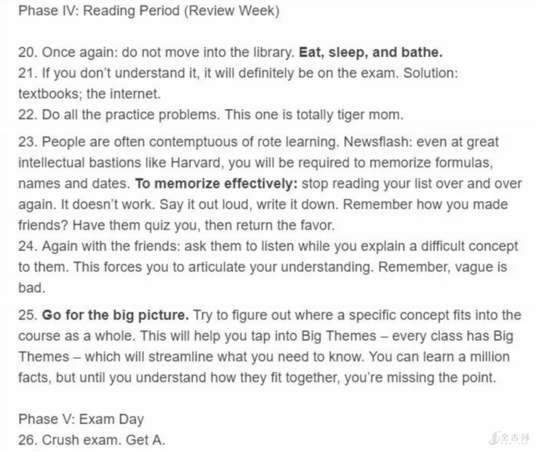 25. 有大局观。试着找出某个具体概念在课程中的整体定位。这会帮助我们挖掘大主题(每门课程都有大主题),精简我们需要知道的内容。你可以学到无数事实,但除非明白它们是如何结合在一起的,否则就错过了重点。