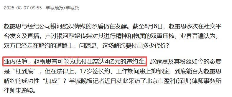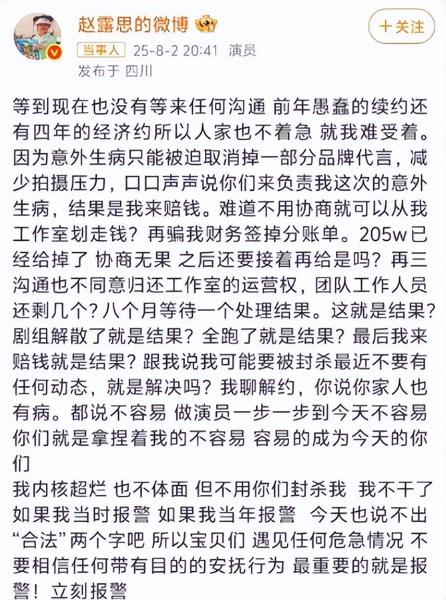 后来身体彻底垮了之后,赵露思无法继续工作,面临违约风险,经纪公司不但不帮忙,还在金钱上继续压榨,不协商解决,直接划走200多万赔偿金,间接导致工作室人陆续离职。